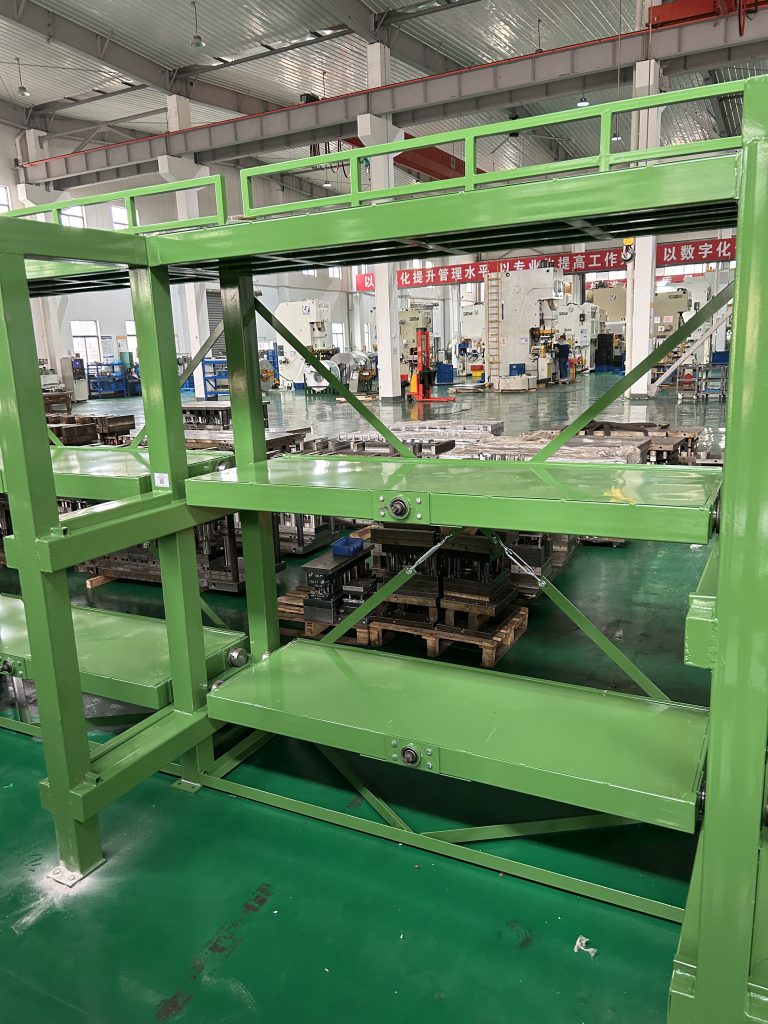 2023年4月12日江蘇海安客戶手搖模具架安裝現場,貨架整體需用RAL6010顏色,頂部安裝防護欄;